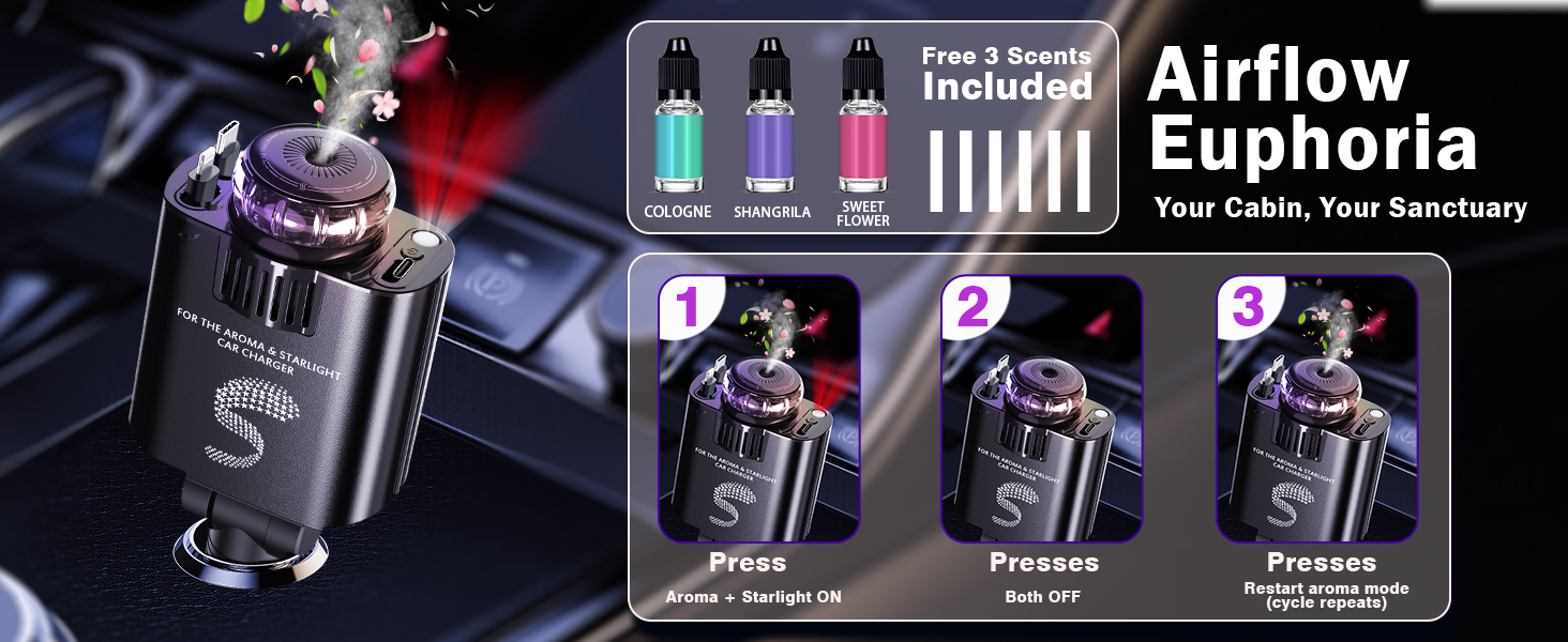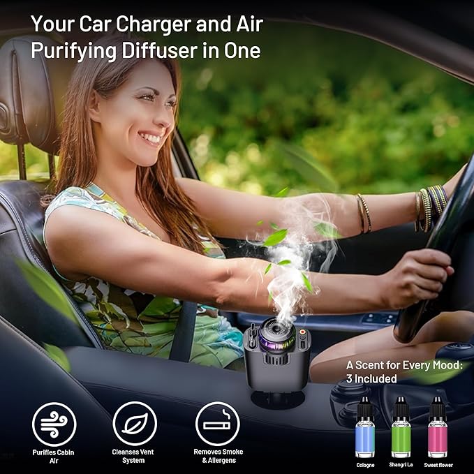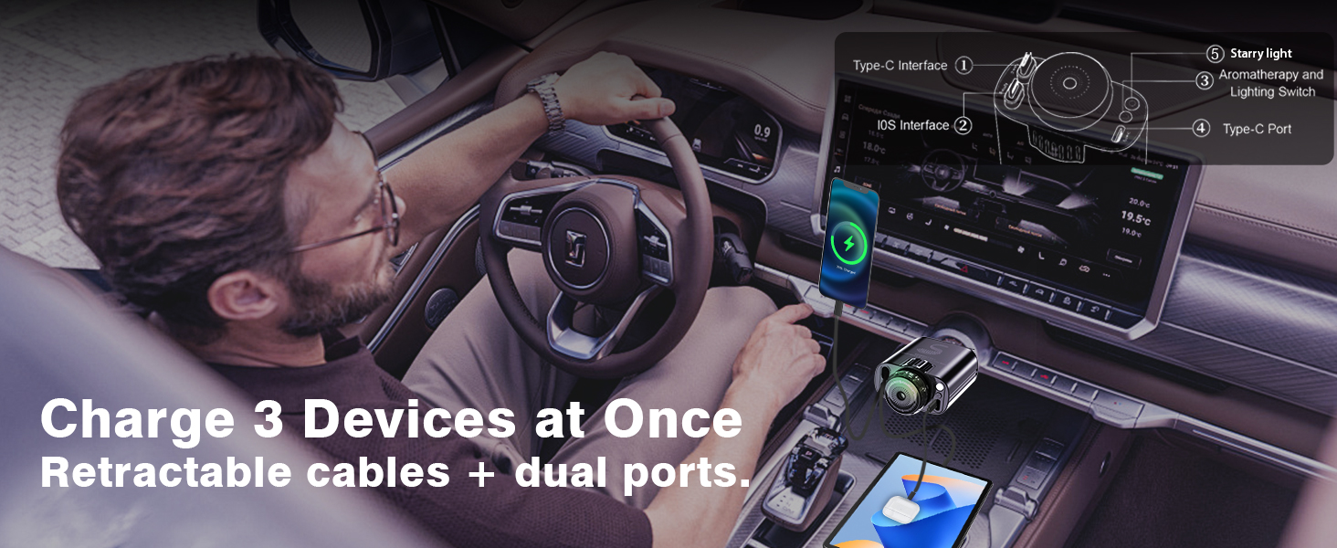 Absolutely love this charger! This is hands down one of the best car accessories I’ve purchased. The charging is super fast with both USB-C and USB-A ports, and the retractable cables work smoothly and stay securely in place. The added aromatherapy feature is a nice touch—makes my car smell great and adds a relaxing vibe.