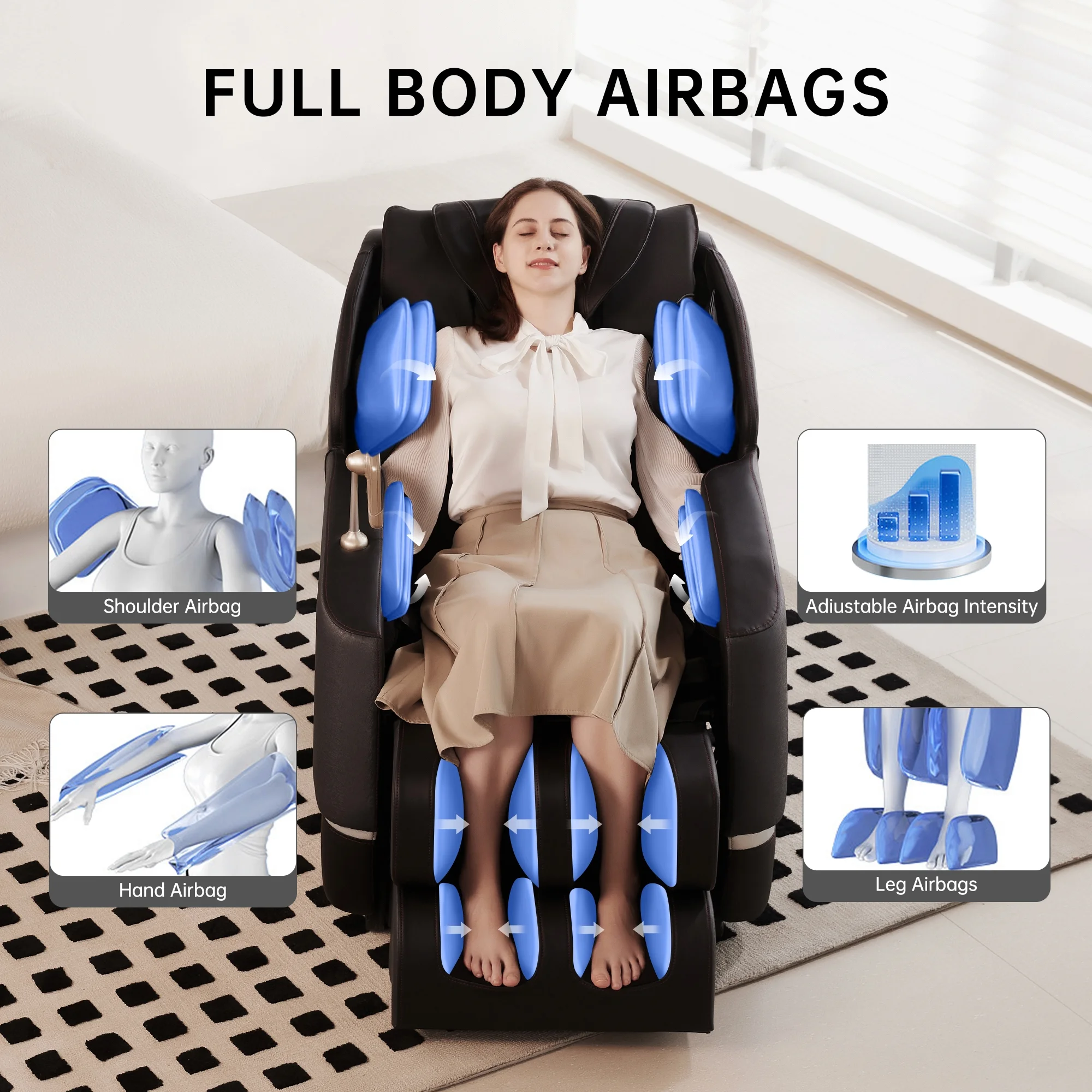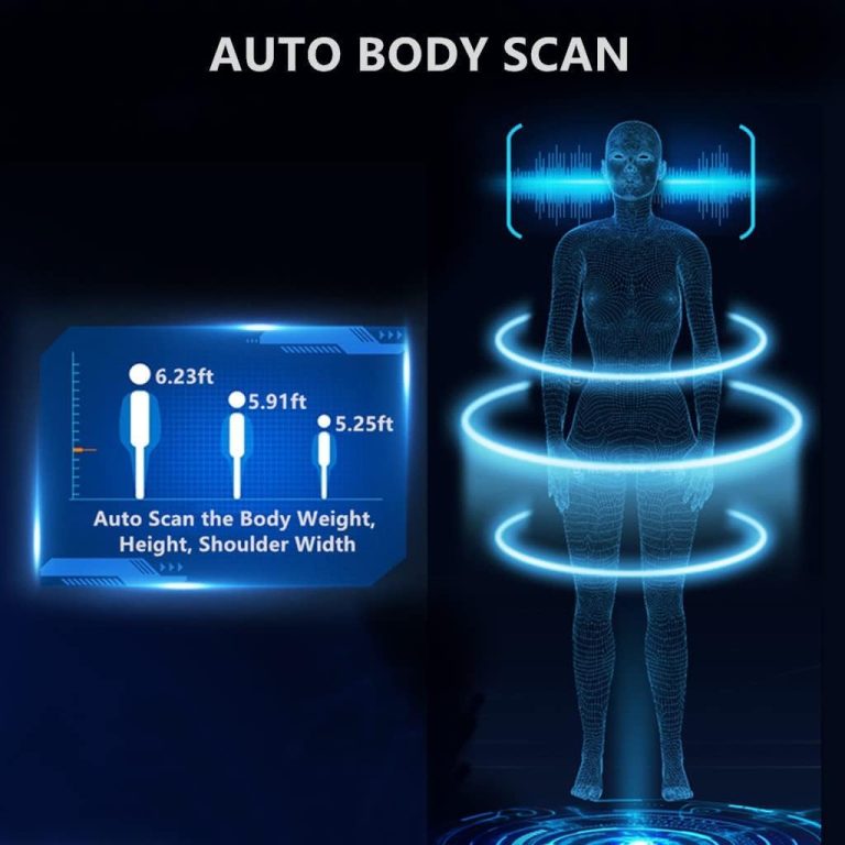 The massage airbags cover the shoulder, arms, hip, calves, and feet area, allowing you to enjoy the Tuina massage in a looping rhythm. Weight Limit: 330 pounds. Internal Seat Width: 21 inches.